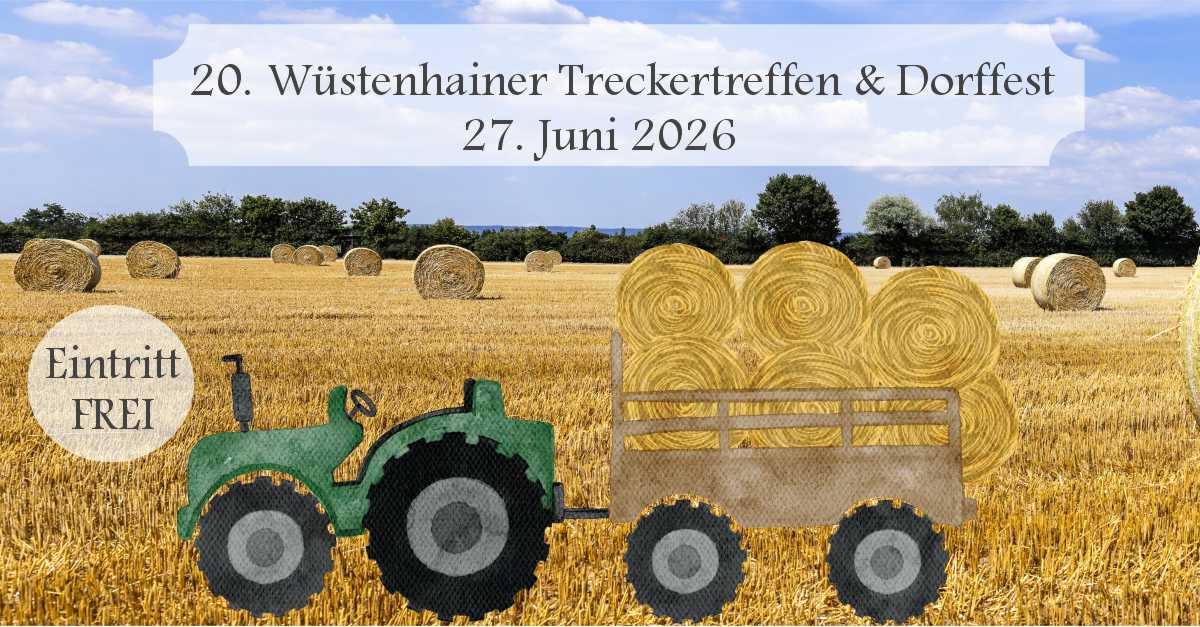 Am 27. Juni 2026 lädt der Heimatverein Wüstenhain zum 20. Treckertreffen und Sommerfest auf den Festplatz an der Kirche ein. Ab 10 Uhr begeistern historische Traktoren, eine große Korsofahrt und spannende Geschicklichkeitswettbewerbe die Besucher. Tagsüber wird ein buntes Familienprogramm mit Blasmusik, Tanzgruppen und bester Verpflegung geboten. Am Abend sorgt ein DJ für Partystimmung und eine volle Tanzfläche bis in die Nacht.