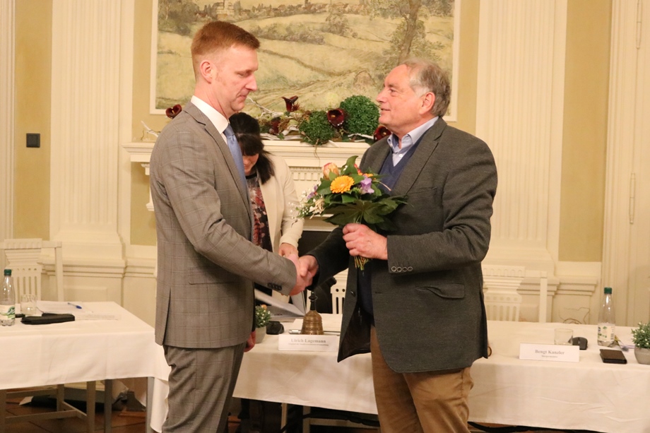 Stadtverordnetenvorsteher Ulrich Lagemann vereidigte Chris Mielchen und Bürgermeister a.D. überreichte ihm das Amtssiegel „Nummer eins“ und wünschte seinem Nachfolger Weisheit, viel Erfolg und Weitblick. Kanzler erinnerte daran, dass gerade viele Herausforderungen anstehen, die gemeinsam angegangen werden müssen. Dabei müssen Bürgermeister, Stadtverordnete und auch die Bürgerinnen und Bürger an einem Strang ziehen.