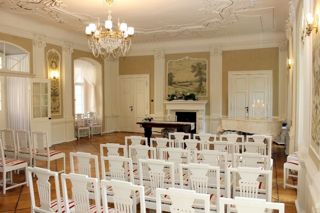 Heiraten ist im Rittersaal auch möglich. Der Saal bietet Platz für bis zu 70 Gäste und beeindruckt vor allem durch sein feierliches Ambiente und den weißen Steinway Flügel, auf welchem auch heute noch gespielt werden kann. Infos zum Heiraten im Rittersaal finden Sie --hier--